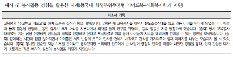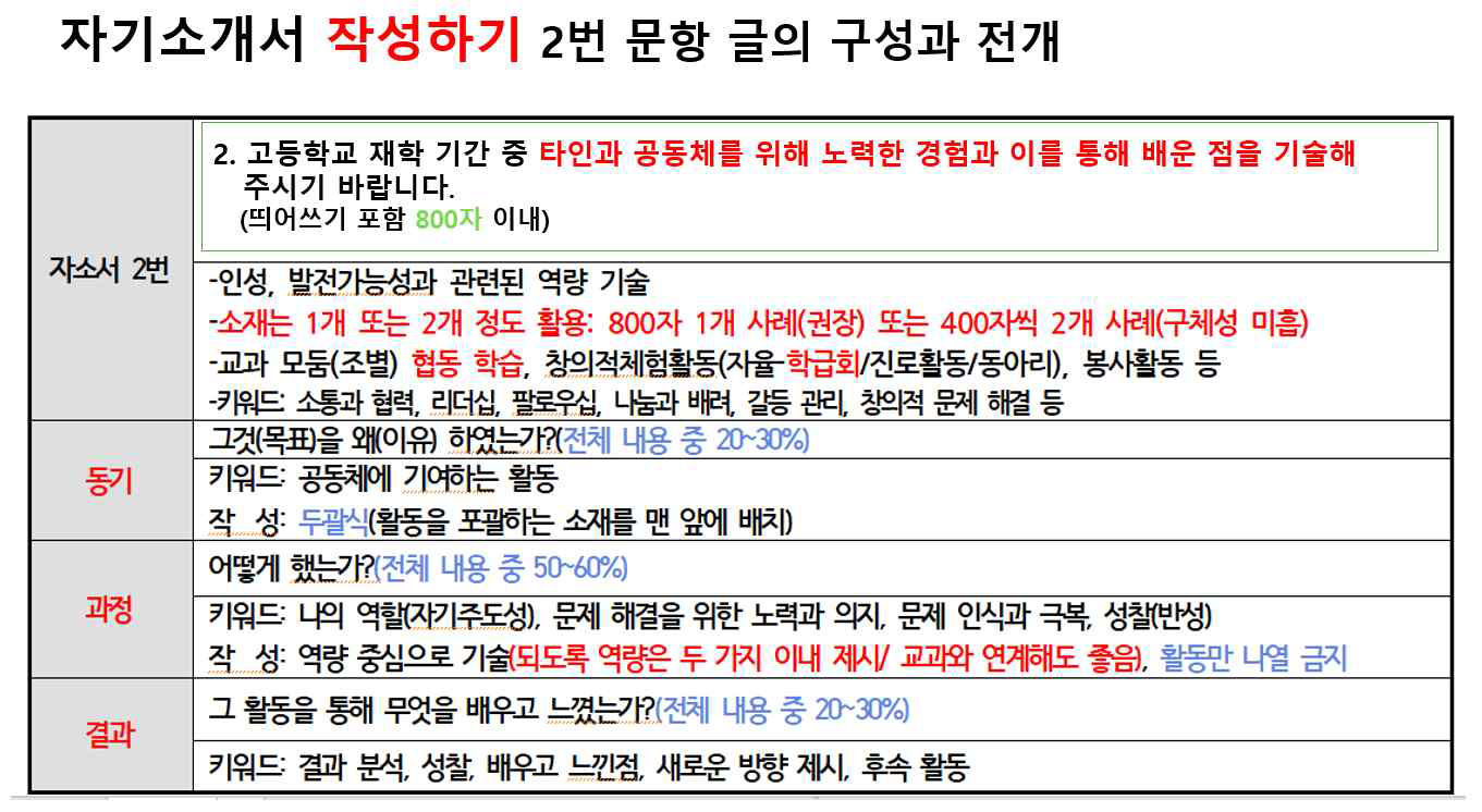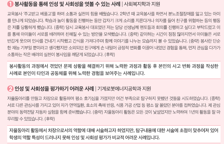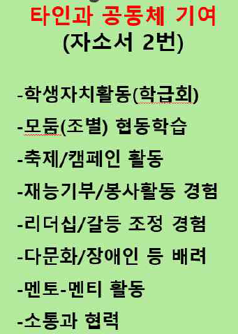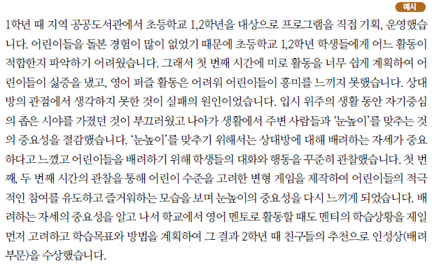 ③ 공동체를 위한 자신의 노력만을 지나치게 강조하면 스스로를 자랑하는 모습만 비춰질 수도 있기 때문에 자신의 노력한 내용만을 강조하기 보다는 노력하는 과정과 그 과정에서 깨달은 점, 이후 노력의 결과 주변인들의 반응 혹은 공동체에 미친 영항 등을 구체적으로 기술하고 이를 통해 지원자 자신이 어떻게 긍정적으로 성장, 변화했는지 느낀 바를 충분히 포함하여 표현하는 것이 좋다.