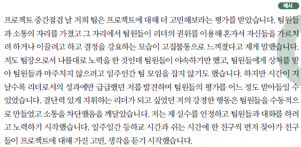 ② 구성원의 화합과 단결을 이끌어내기 위한 리더십의 구체적인 행동 경험, 공동체가 갈등 상황에서 부딪혔을때 갈등 관리를 통해 문제를 해결한 경험을 중심으로 기술한다.