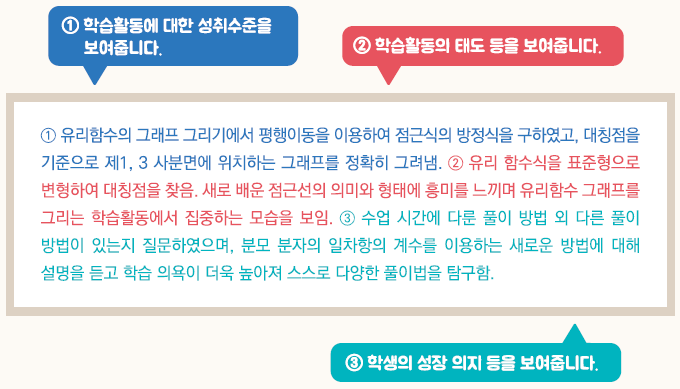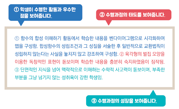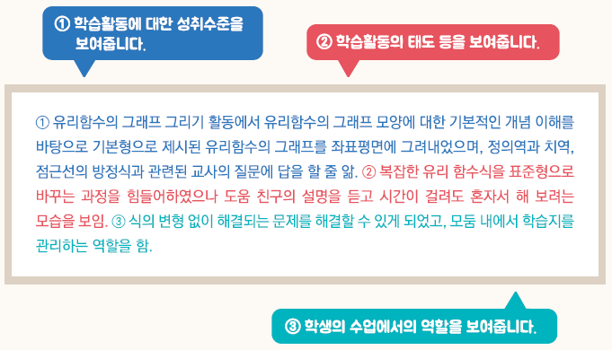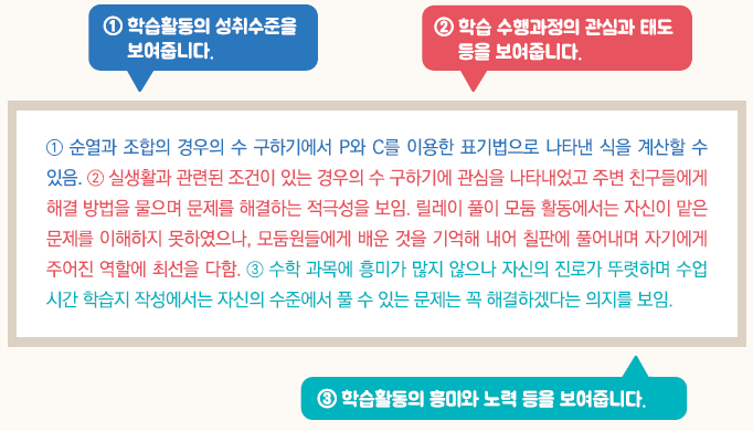 - 교육과정 성취기준과 평가기준에 기반한 학생의 학업 내용 및 성취수준 등