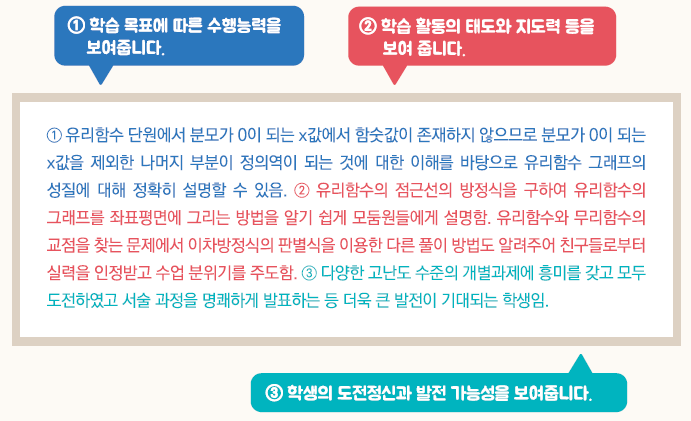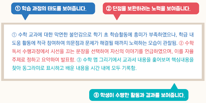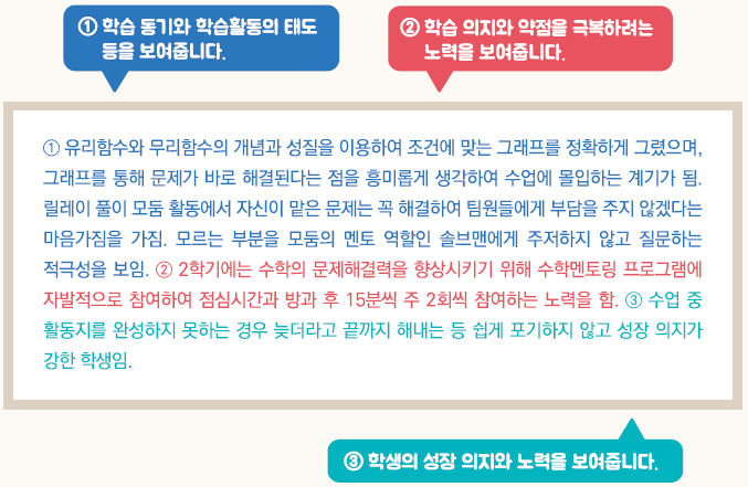 - 학생이 보여준 강점, 약점을 극복하기 위한 노력 등