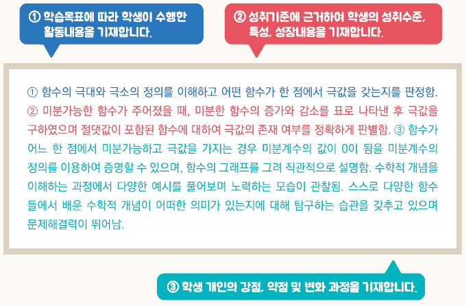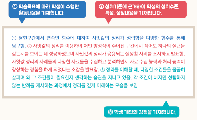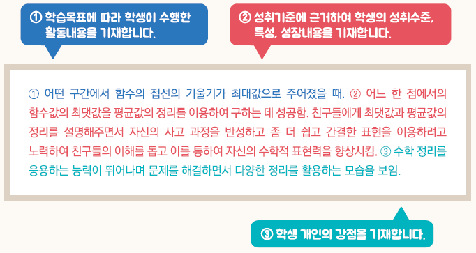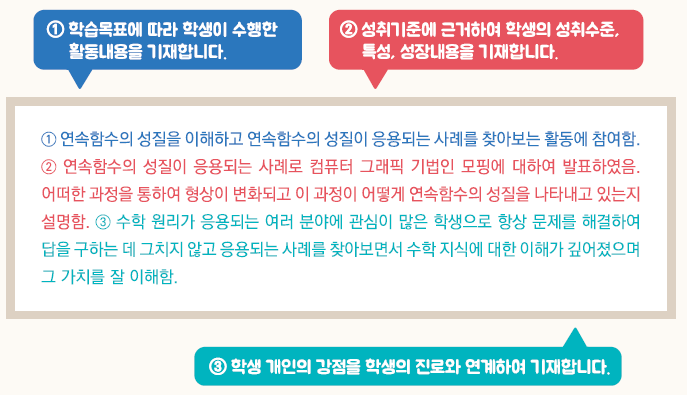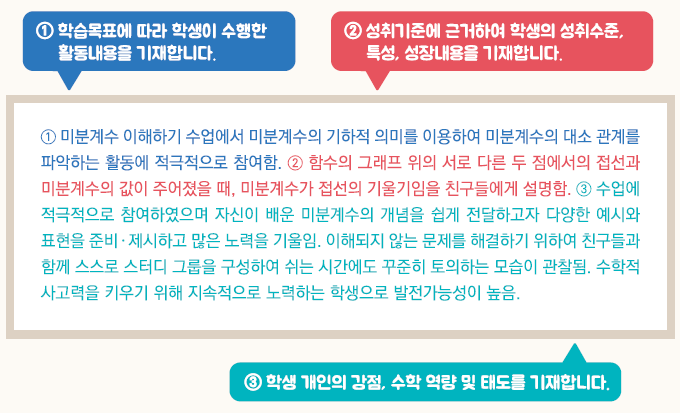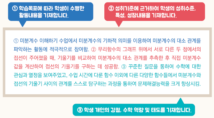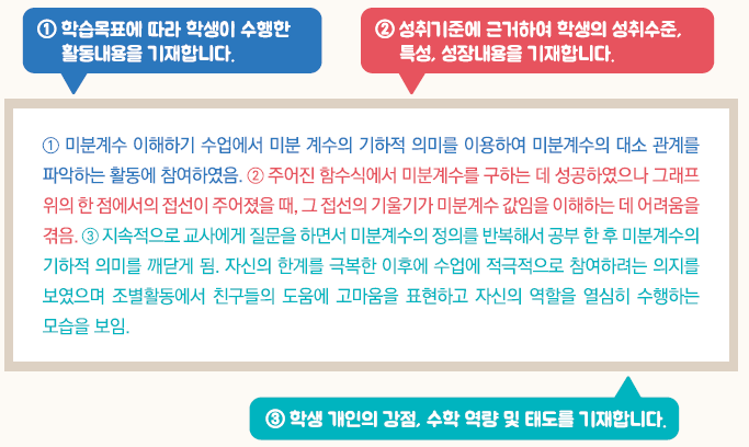- 교육과정 성취기준과 평가기준에 기반한 학생의 학업 내용 및 성취수준 등