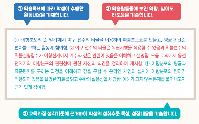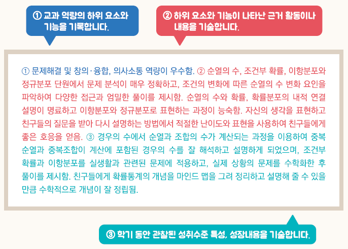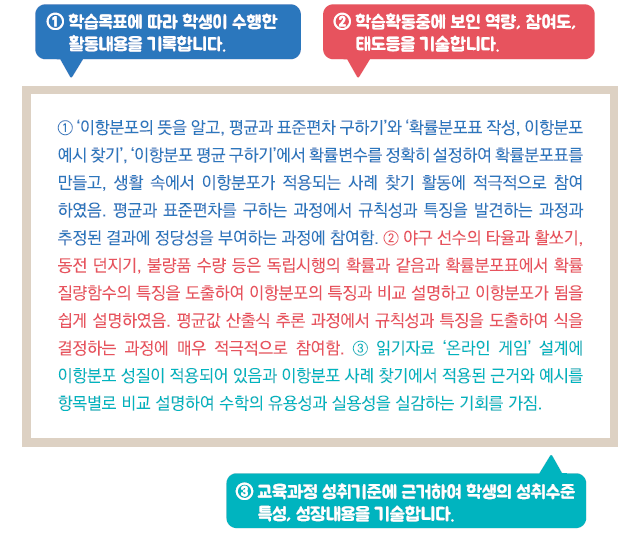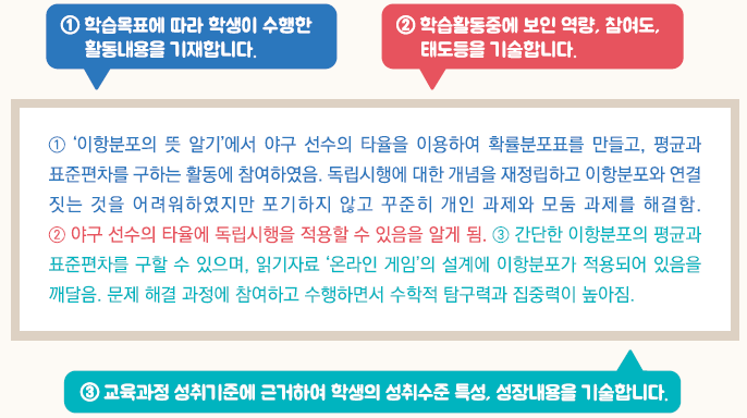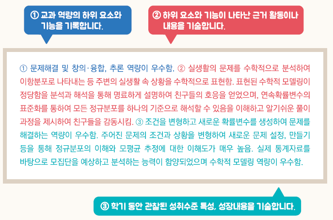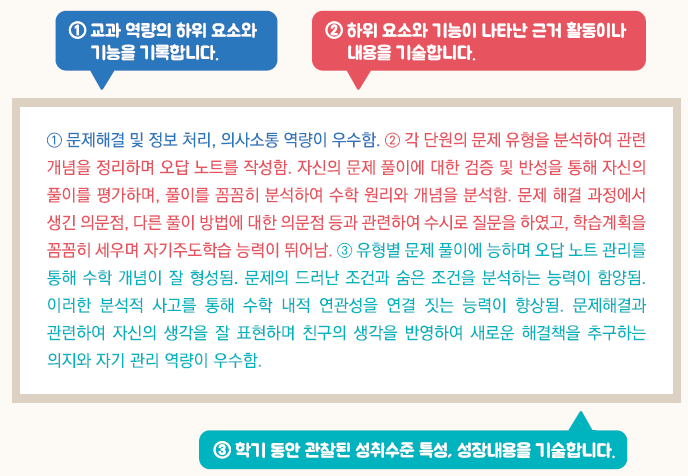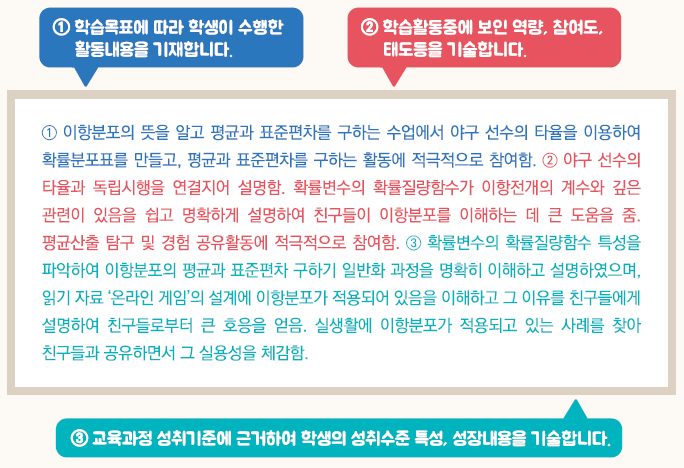 - 교육과정 성취기준과 평가기준에 기반한 학생의 학업 내용 및 성취수준 등