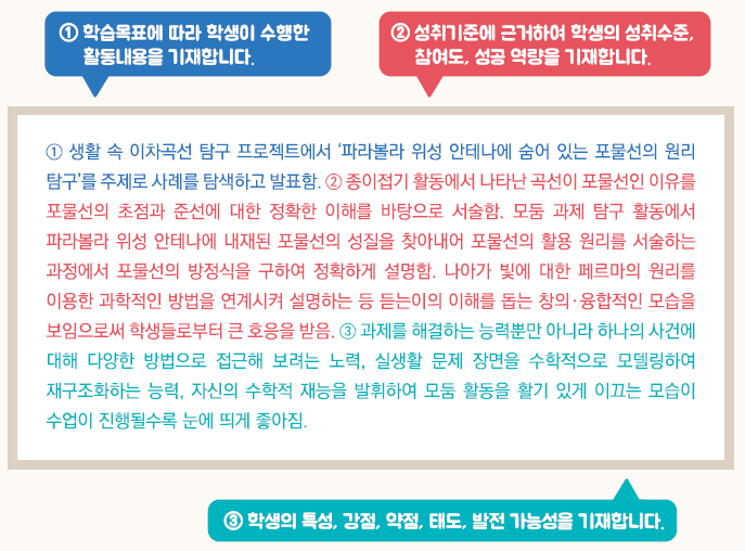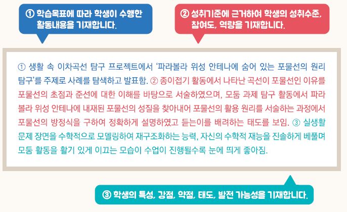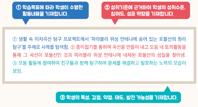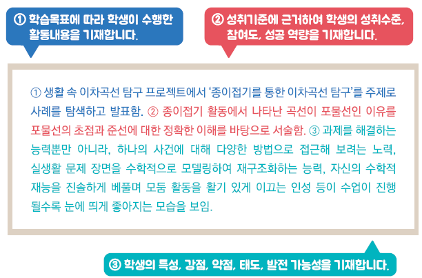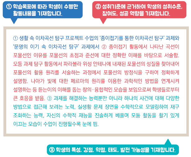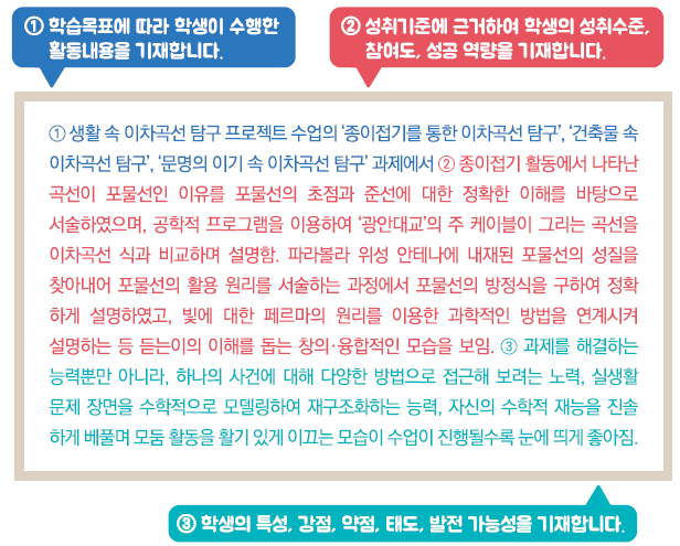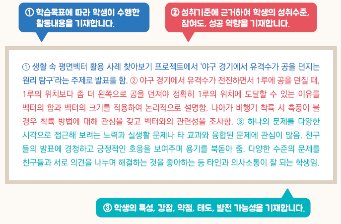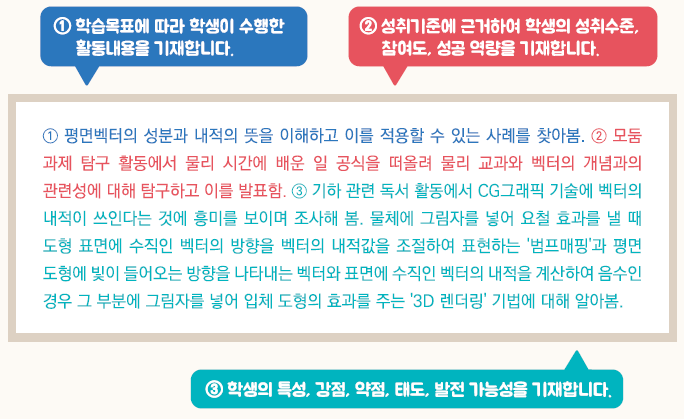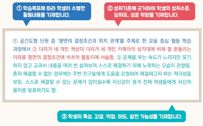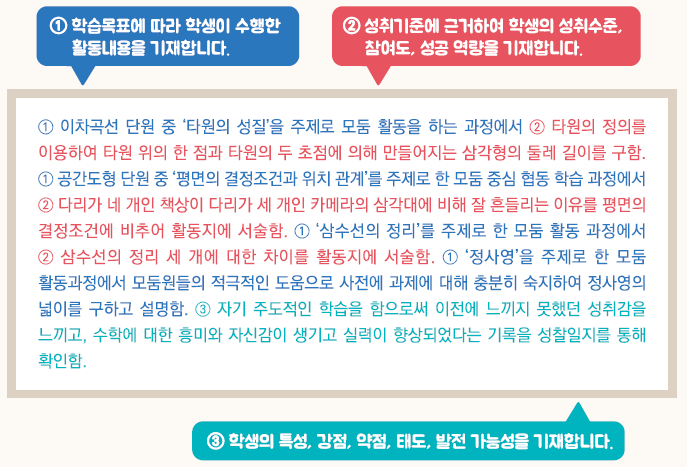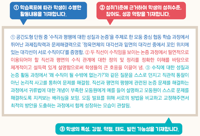 - 교육과정 성취기준과 평가기준에 기반한 학생의 학업 내용 및 성취수준 등