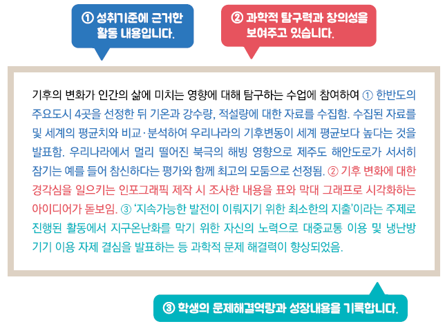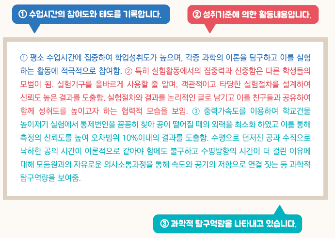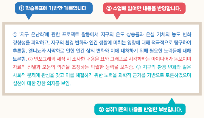 - 교육과정 성취기준과 평가기준에 기반한 학생의 학업 내용 및 성취수준 등