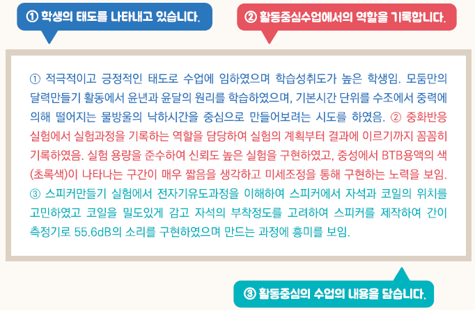- 학생 개인별 또는 모둠별 활동 중 보여준 태도, 학습참여도, 역량 등