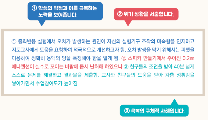 - 학생이 보여준 강점, 약점을 극복하기 위한 노력 등