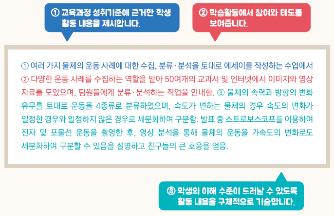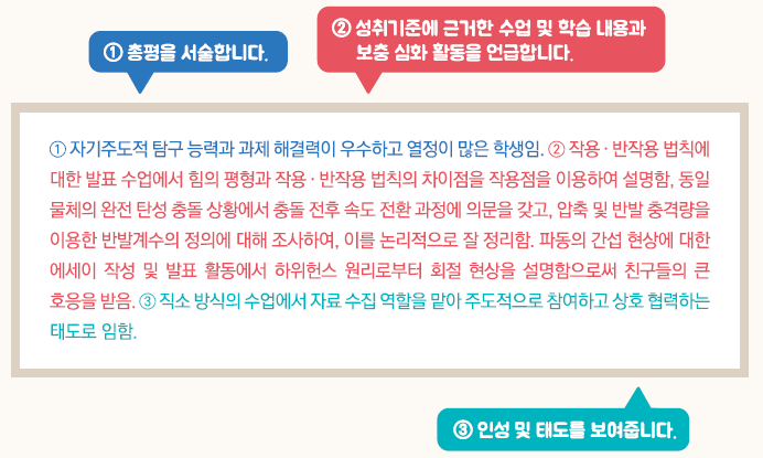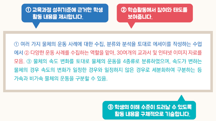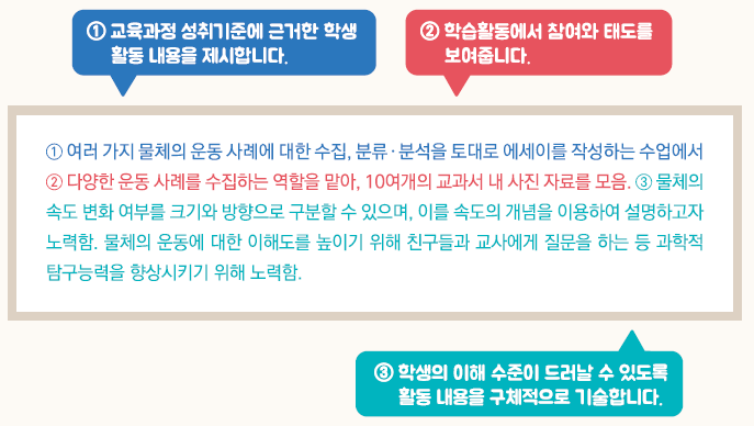 - 교육과정 성취기준과 평가기준에 기반한 학생의 학업 내용 및 성취수준 등