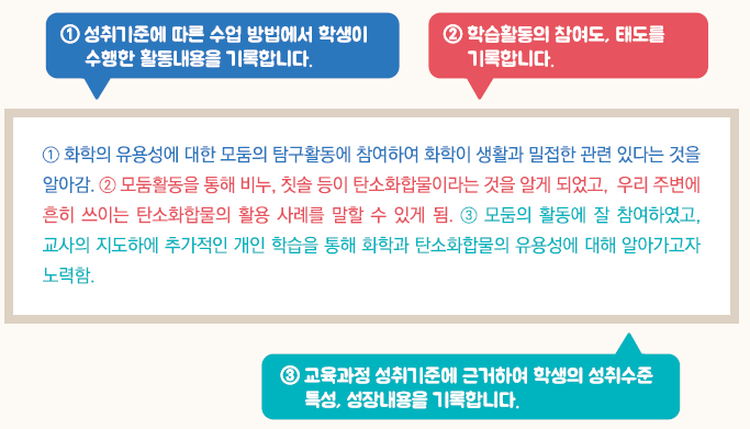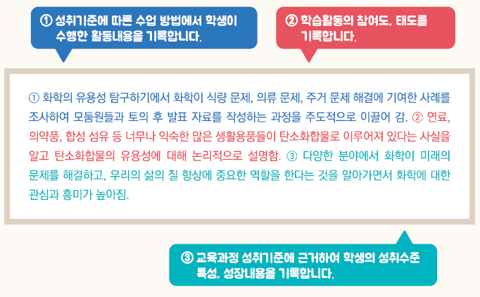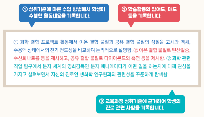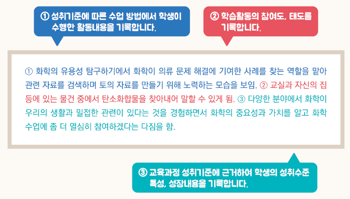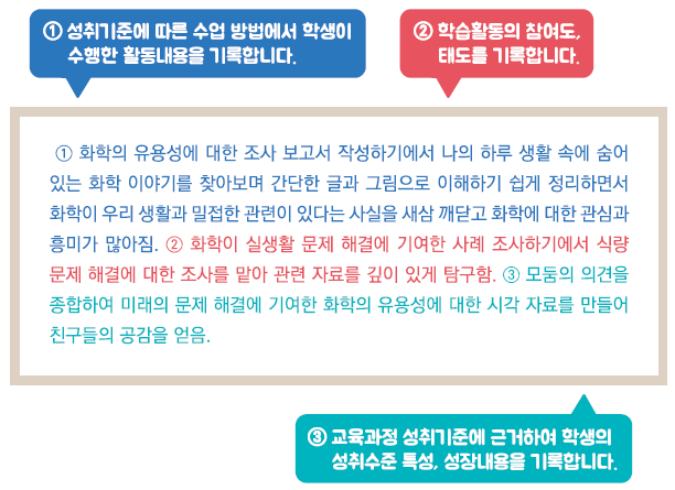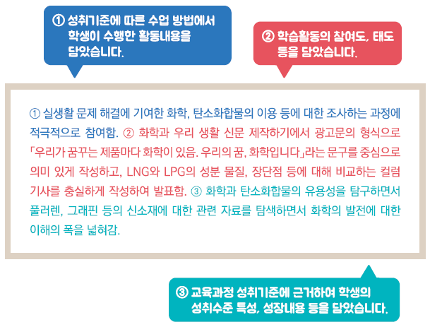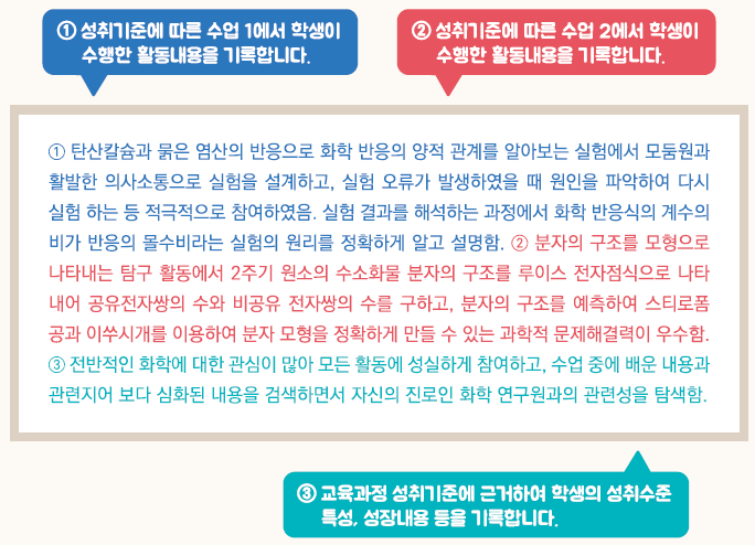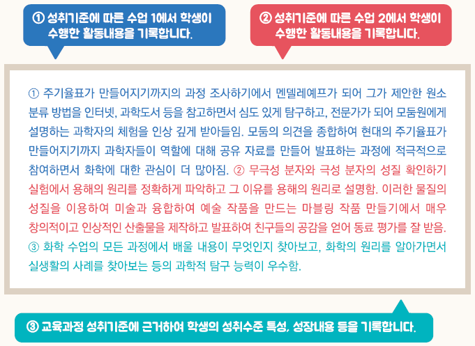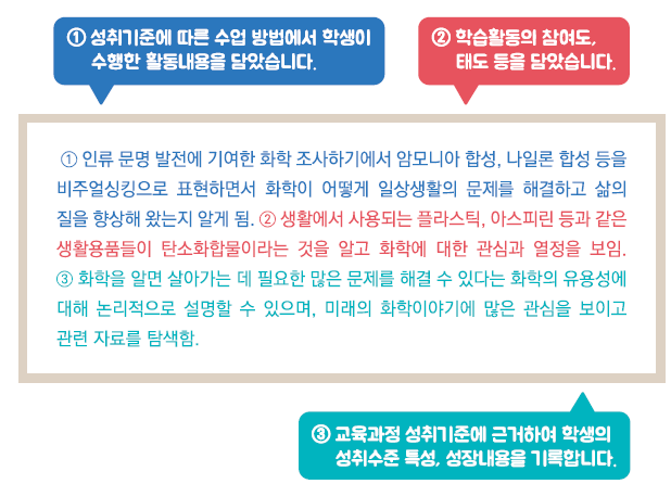 - 교육과정 성취기준과 평가기준에 기반한 학생의 학업 내용 및 성취수준 등