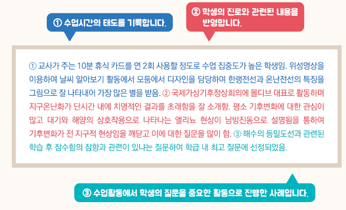 | 생명과학Ⅰ 세부능력 및 특기사항(세특) 예시 (0) | 2021.07.15 |