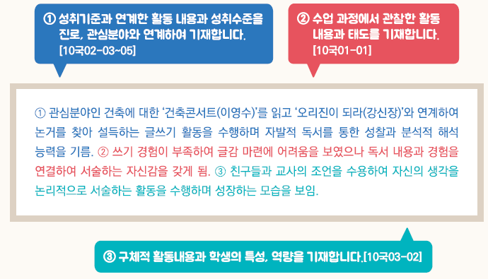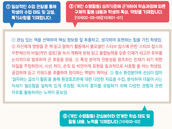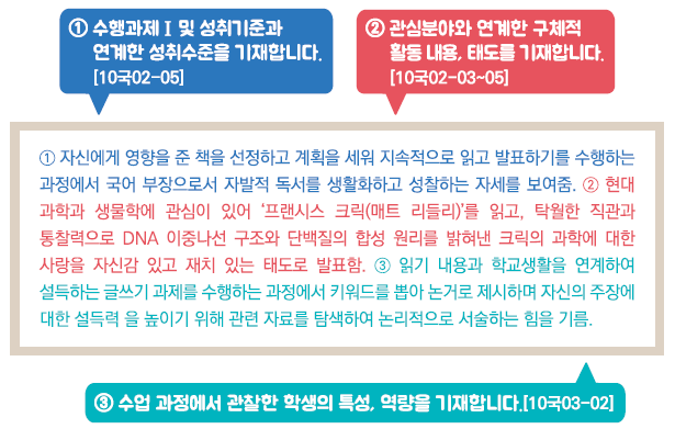 - 교육과정 성취기준과 평가기준에 기반한 학생의 학업 내용 및 성취수준 등