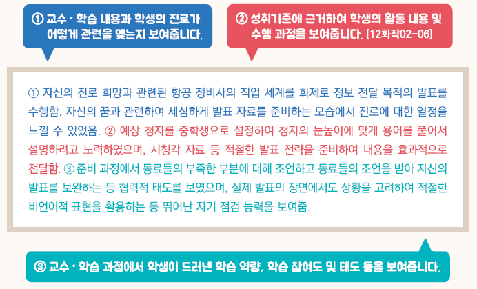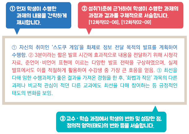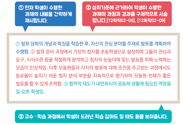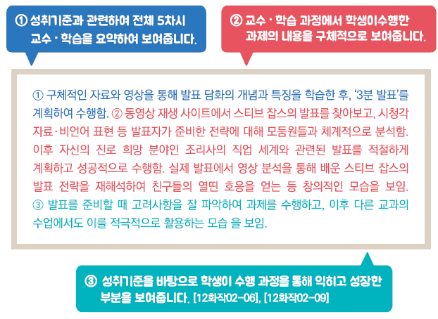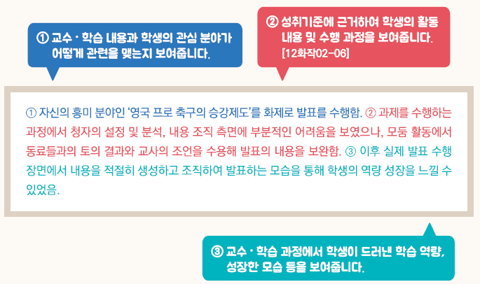 - 교육과정 성취기준과 평가기준에 기반한 학생의 학업 내용 및 성취수준 등