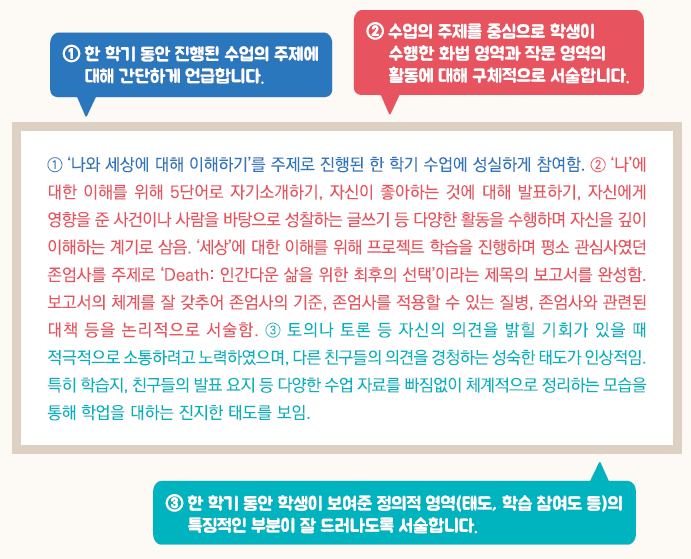 - 학생의 수행평가 결과물 및 과정에 대한 관찰기록을 활용