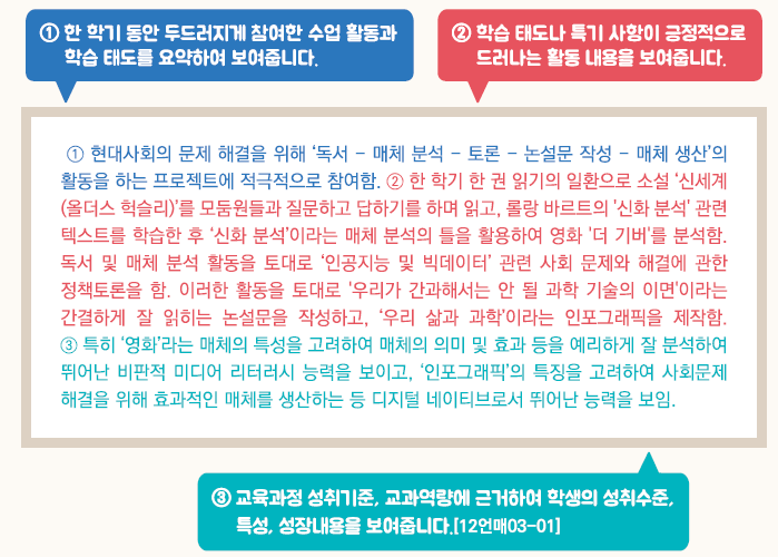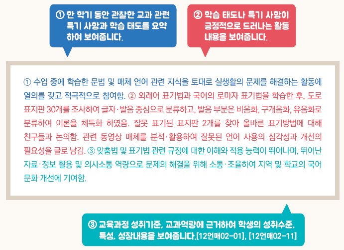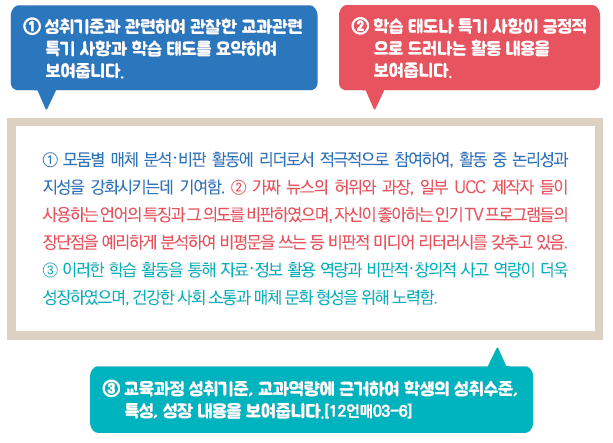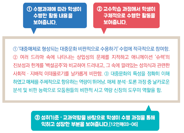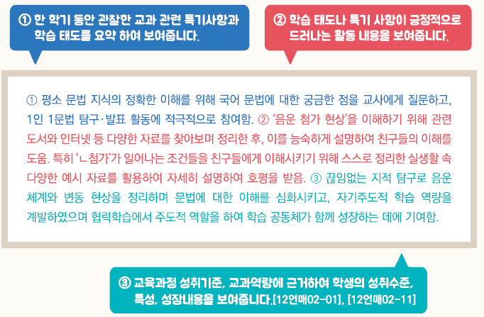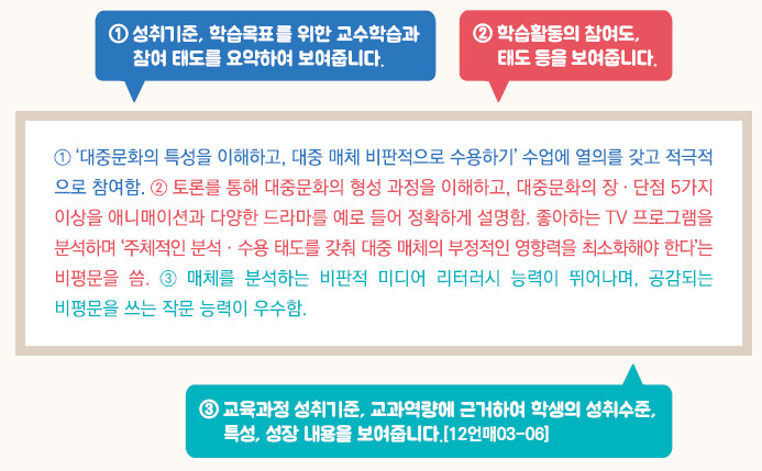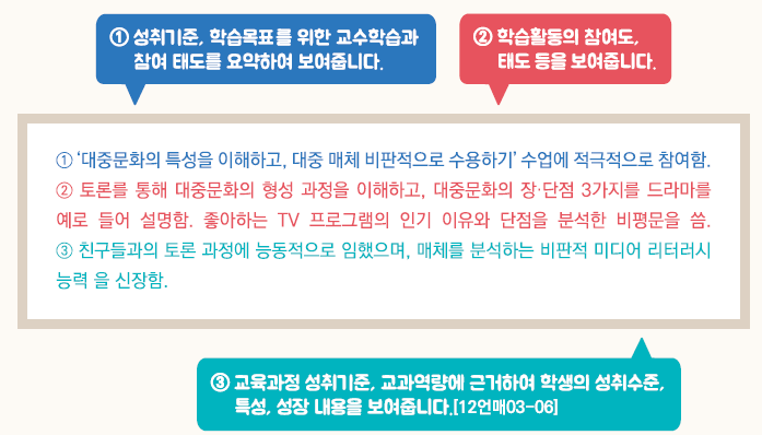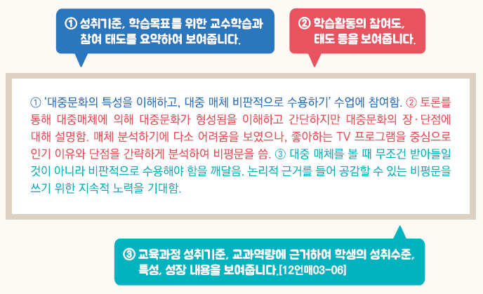 - 교육과정 성취기준과 평가기준에 기반한 학생의 학업 내용 및 성취수준 등