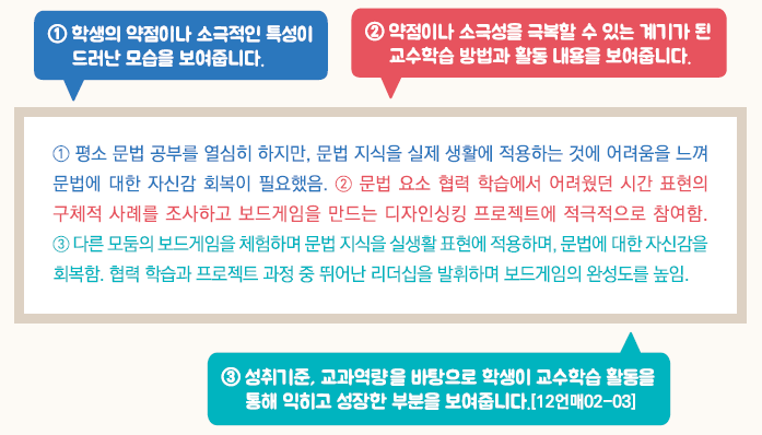 - 학생이 보여준 강점, 약점을 극복하기 위한 노력 등