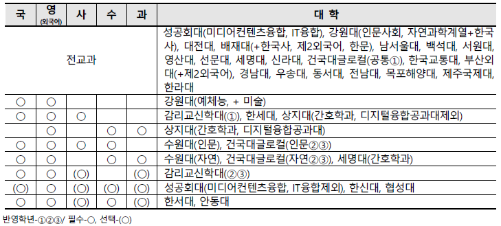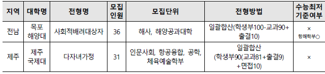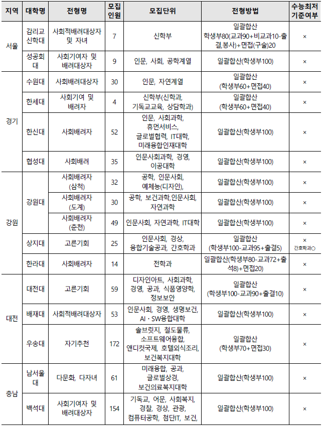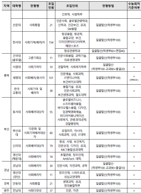- 전형명으로 사회배려대상자, 다문화/다자녀, 사회기여배려대상자, 고른기회전형 등에서 선발하여 대부분 일괄합산전형을 실시.