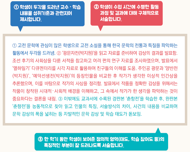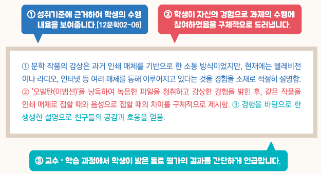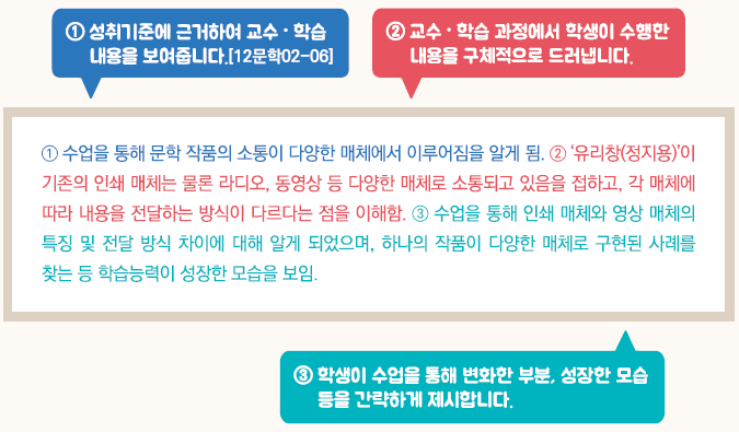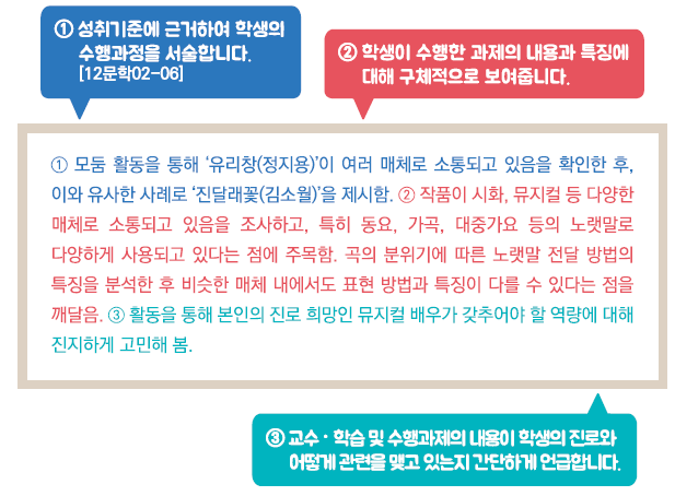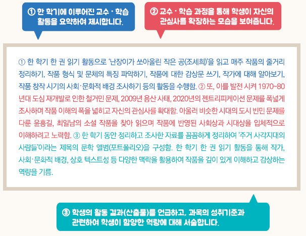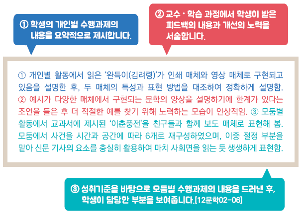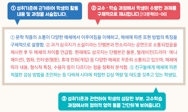 - 교육과정 성취기준과 평가기준에 기반한 학생의 학업 내용 및 성취수준 등