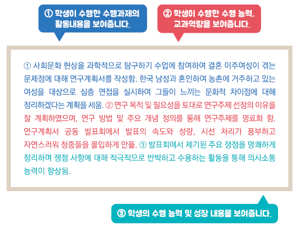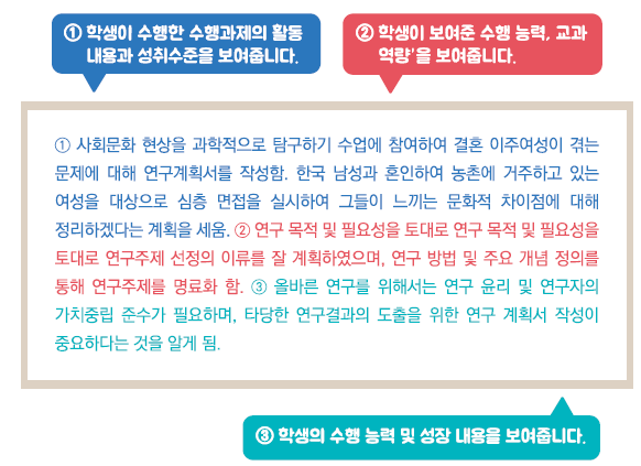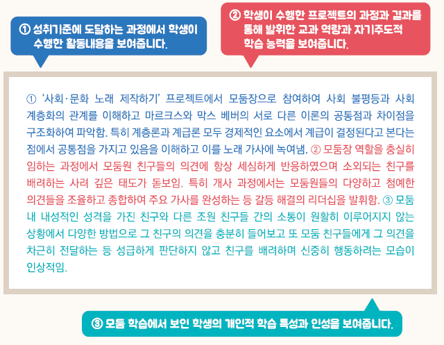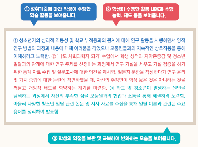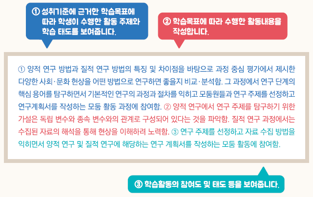 - 교육과정 성취기준과 평가기준에 기반한 학생의 학업 내용 및 성취수준 등