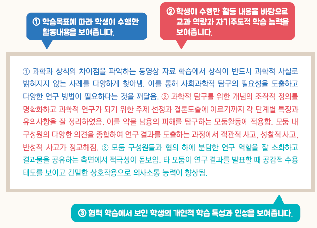 - 학생의 수행평가 결과물 및 과정에 대한 관찰기록을 활용