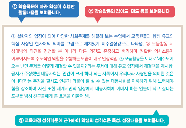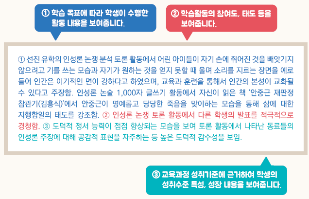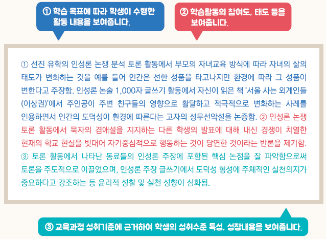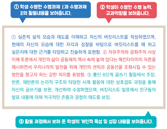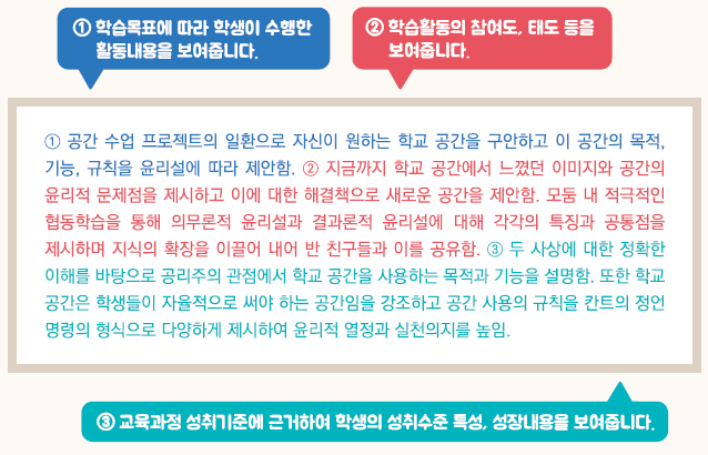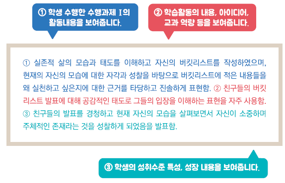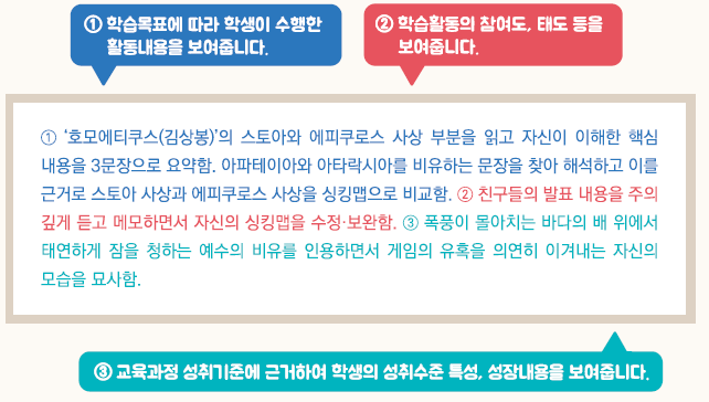 - 교육과정 성취기준과 평가기준에 기반한 학생의 학업 내용 및 성취수준 등
