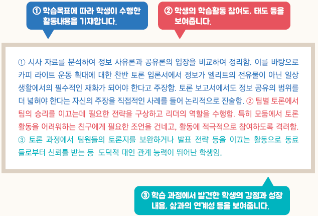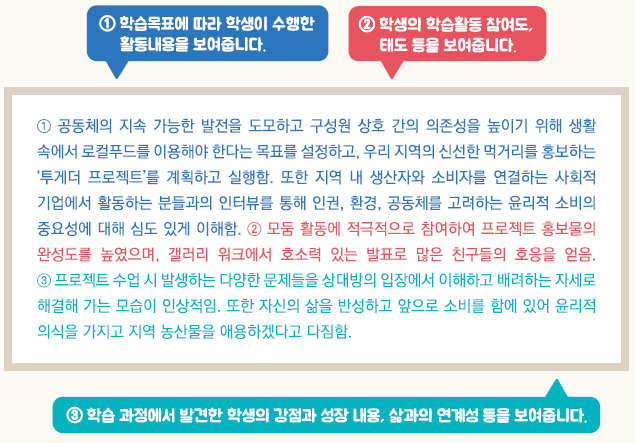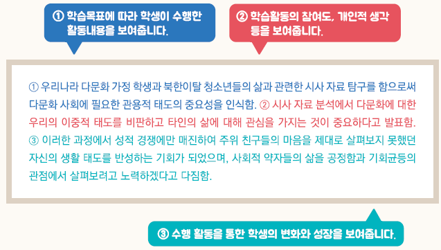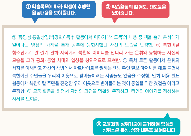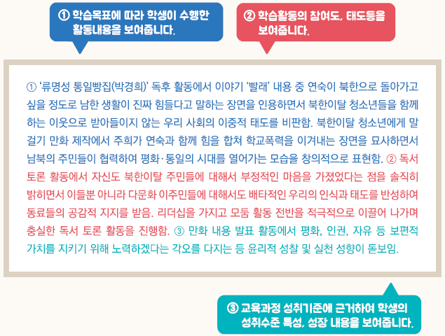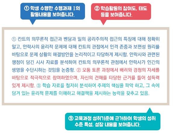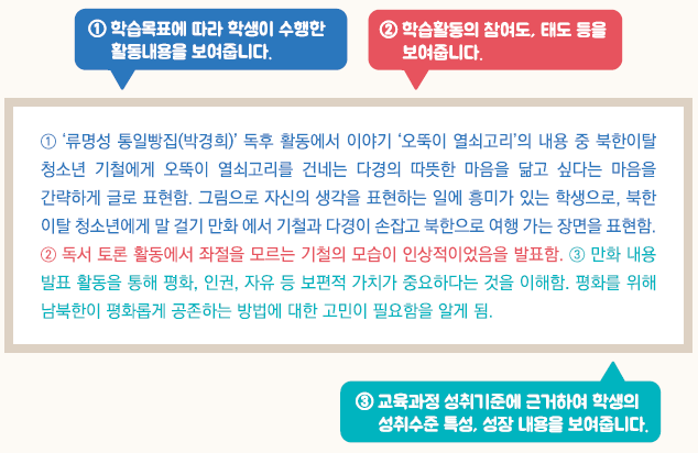 - 교육과정 성취기준과 평가기준에 기반한 학생의 학업 내용 및 성취수준 등