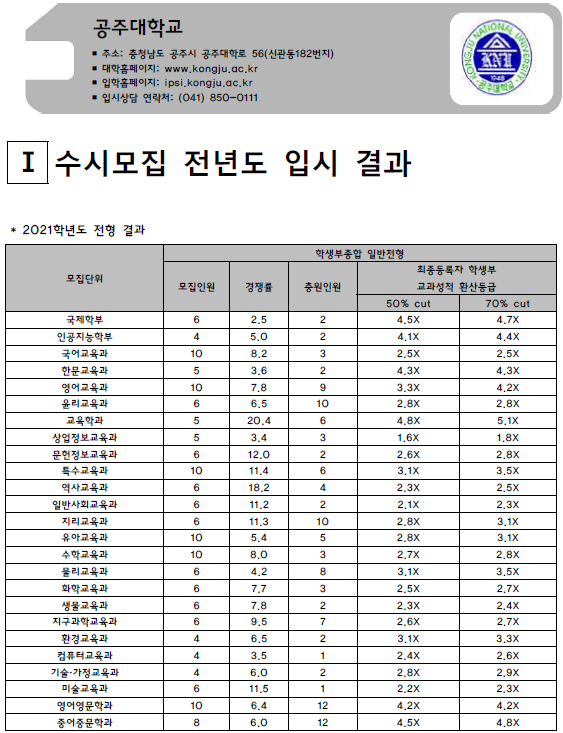 | 공주교육대학교(공주교대) 2021학년도 입시결과-수시등급. 정시 커트라인 (0) | 2021.08.02 |