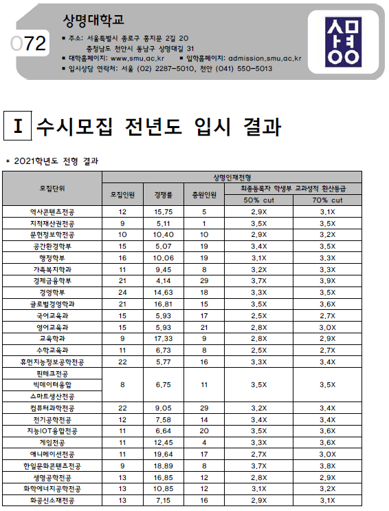 | 상명대학교 제2캠퍼스 2021학년도 입시결과-수시등급. 정시 커트라인 (0) | 2021.08.05 |