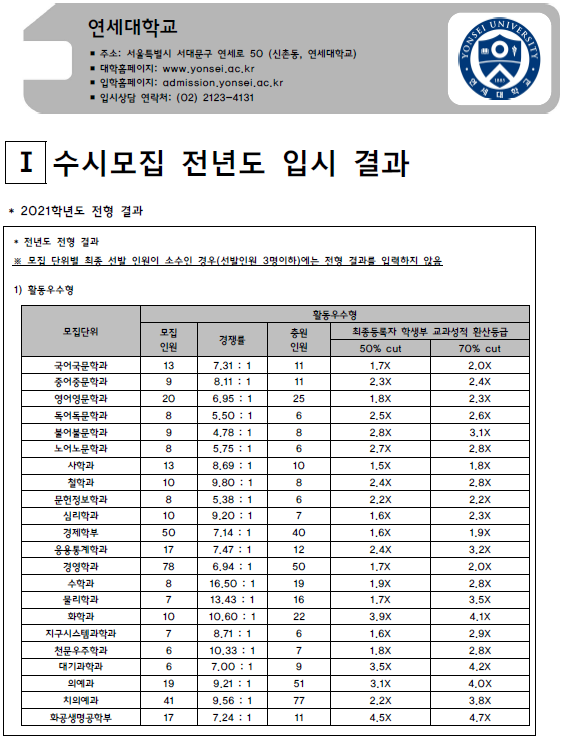 | 연세대학교 미래캠퍼스 2021학년도 입시결과-수시등급. 정시 커트라인 (0) | 2021.08.05 |