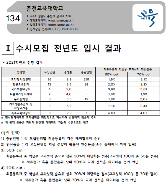 | 청주교육대학교(청주교대) 2021학년도 입시결과-수시등급. 정시 커트라인 (0) | 2021.08.06 |