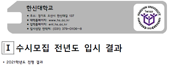 | 한세대학교 2021학년도 입시결과-수시등급. 정시 커트라인 (0) | 2021.08.09 |