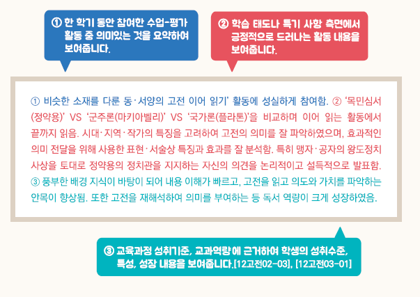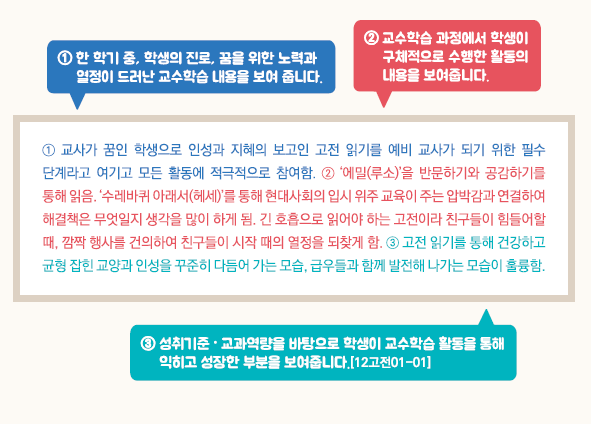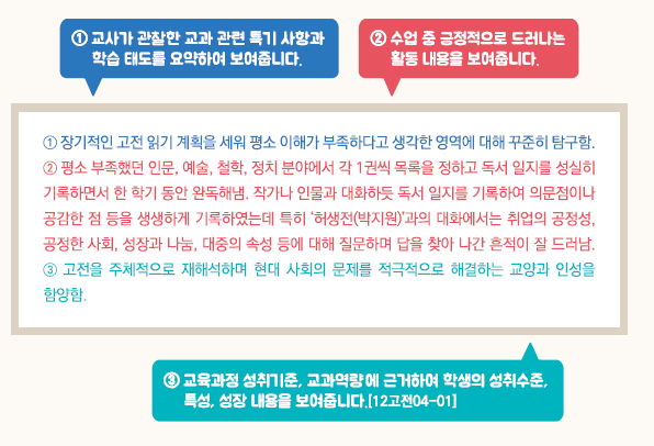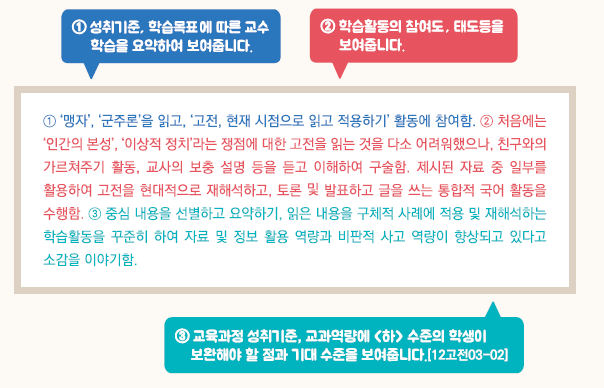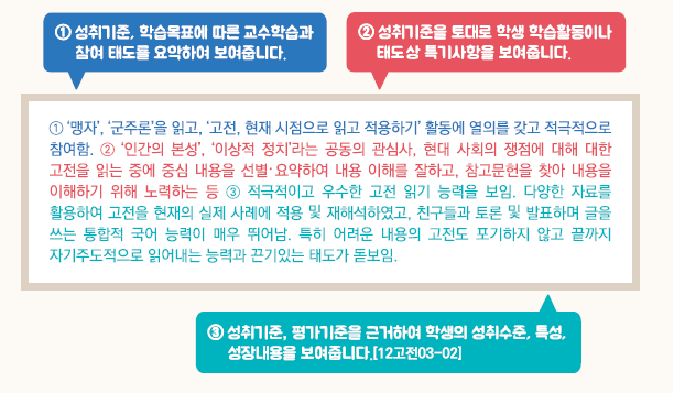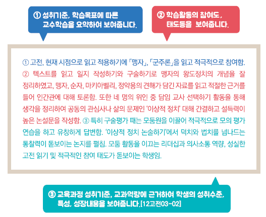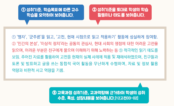 - 교육과정 성취기준과 평가기준에 기반한 학생의 학업 내용 및 성취수준 등