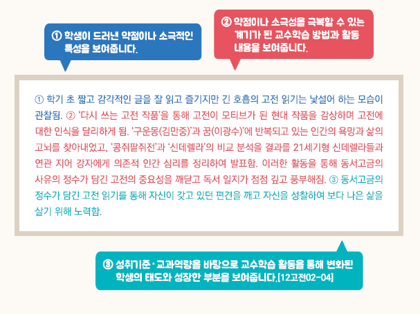 - 학생이 보여준 강점, 약점을 극복하기 위한 노력 등
