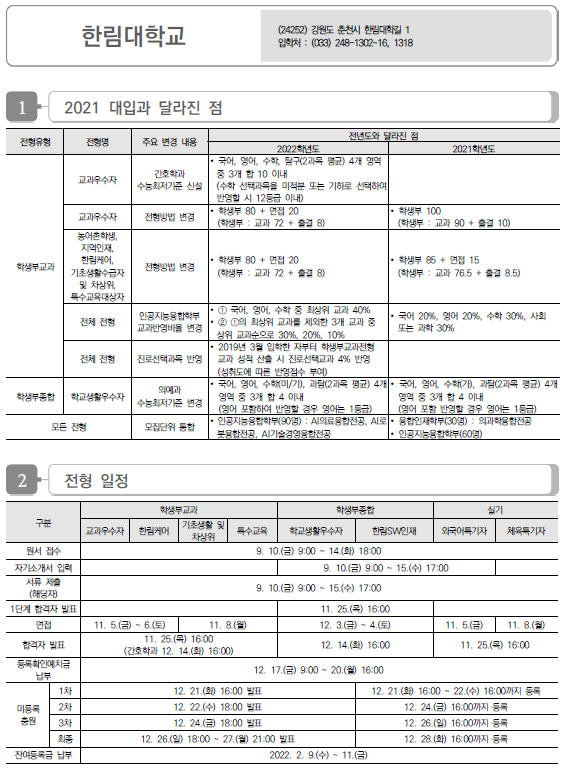 | 한서대학교 2022학년도 수시전형 방법, 모집요강 및 전년도 수시 입시결과(수시등급) (0) | 2021.08.17 |