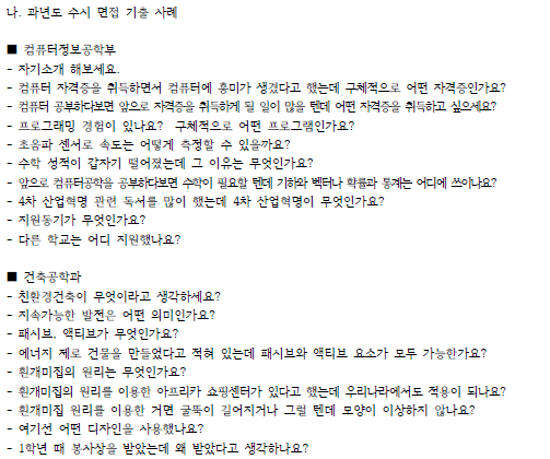 | 2022학년도 수시 면접 대비 전년도 기출문제 -③ 가천대, 가톨릭대, 강원대, 강릉대, 건국대, 경기대 (0) | 2021.09.23 |