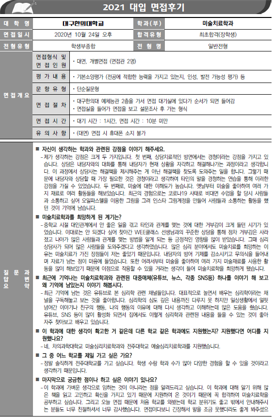| 2022학년도 수시 면접 대비 전년도 기출문제 -③ 의대, 치대, 간호학과, 한의대 (0) | 2021.09.30 |