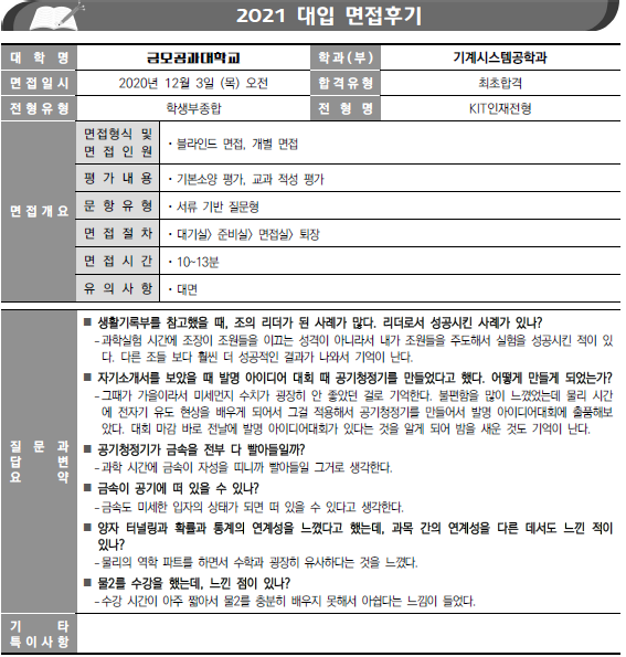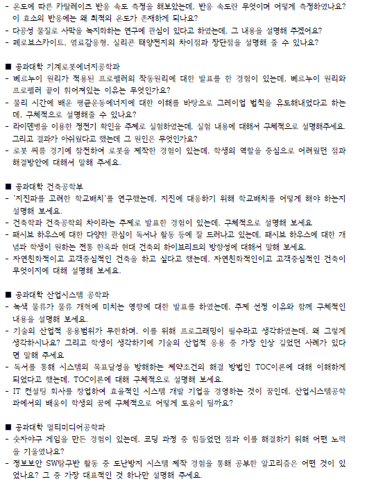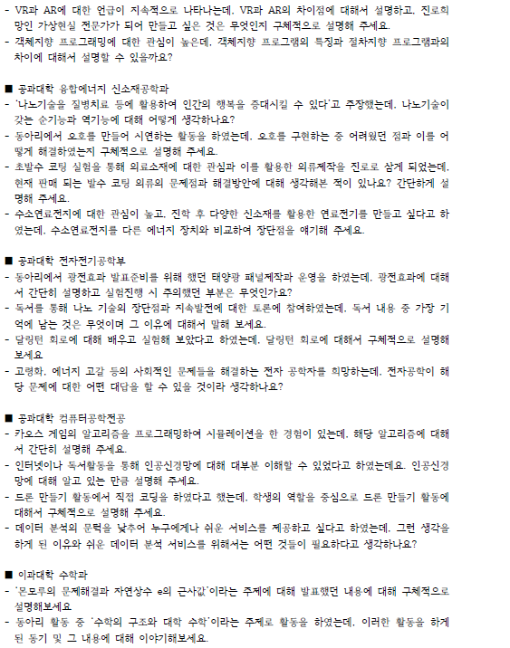 | 2022학년도 수시 면접 대비 전년도 기출문제 -③ 사관학교(육사,해사,공사, 국간사), 특수목적대(DGIST, GIST, UNIST, POSTEC, KAIST) (0) | 2021.09.30 |
