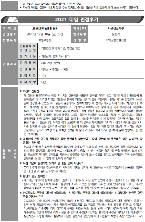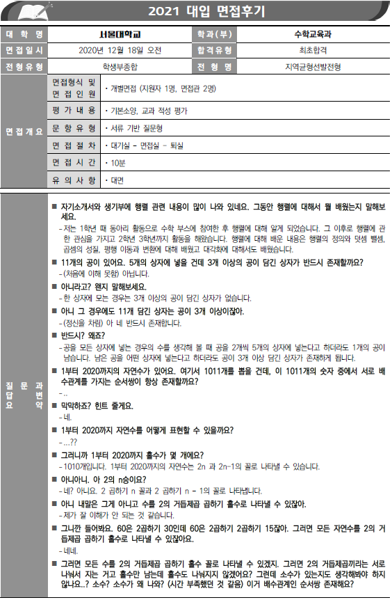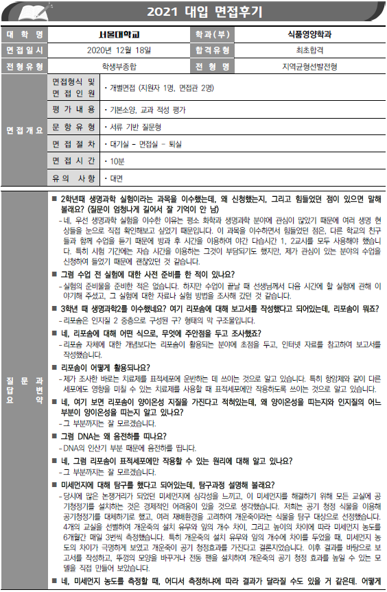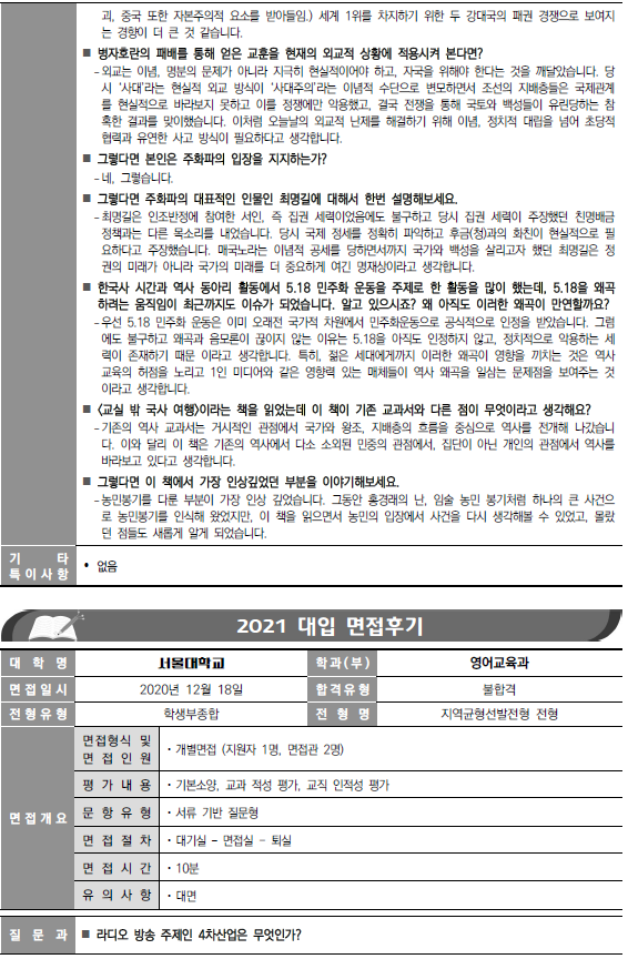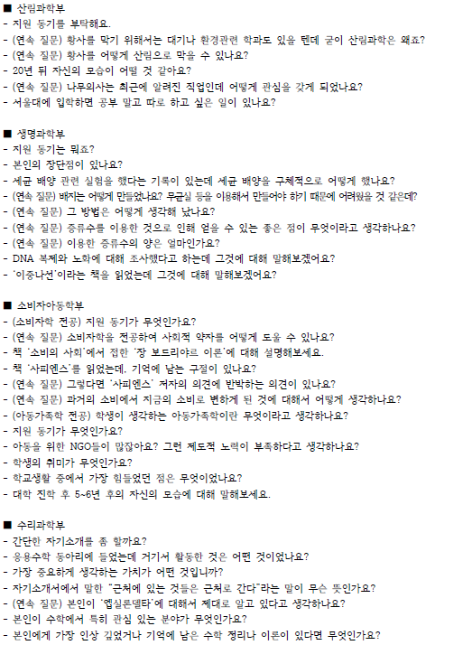 | 2022학년도 수시 면접 대비 전년도 기출문제 -③ 명지대, 상명대, 서울과학기술대 (0) | 2021.10.05 |