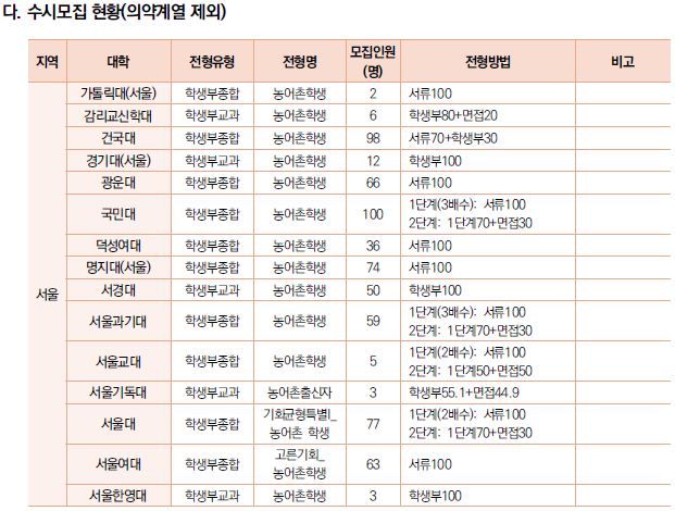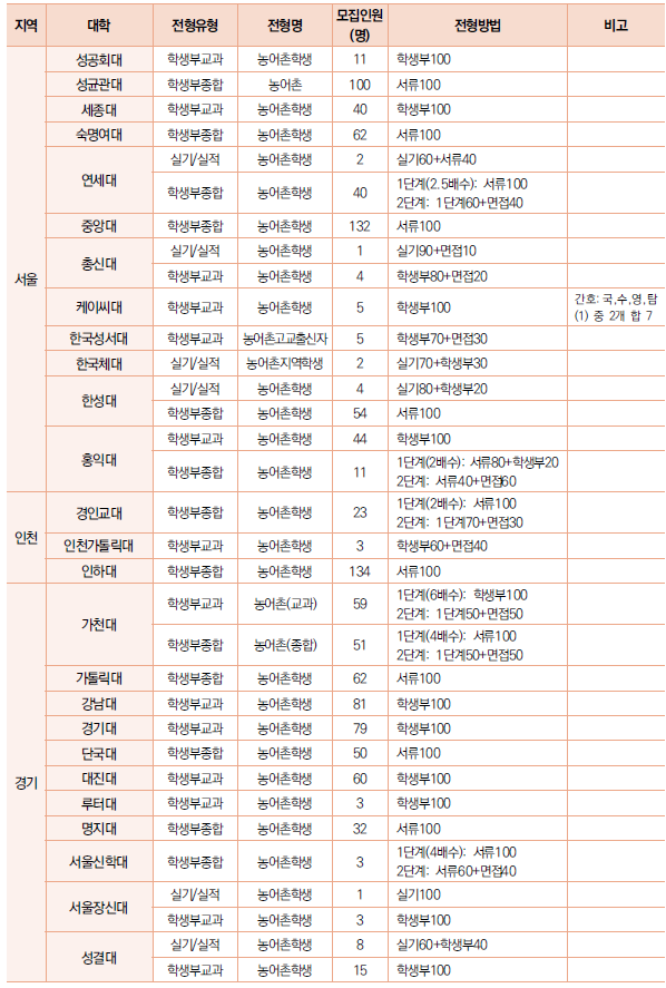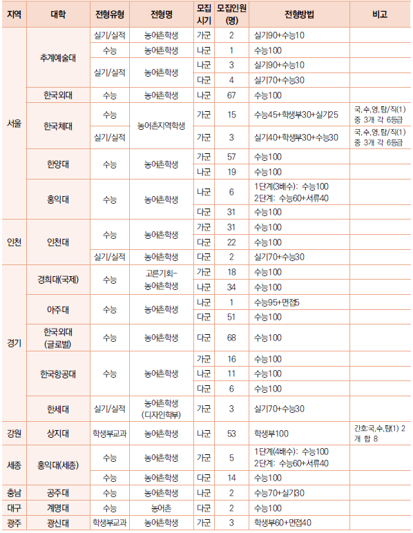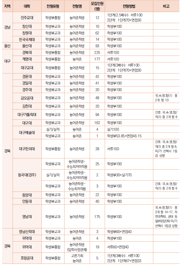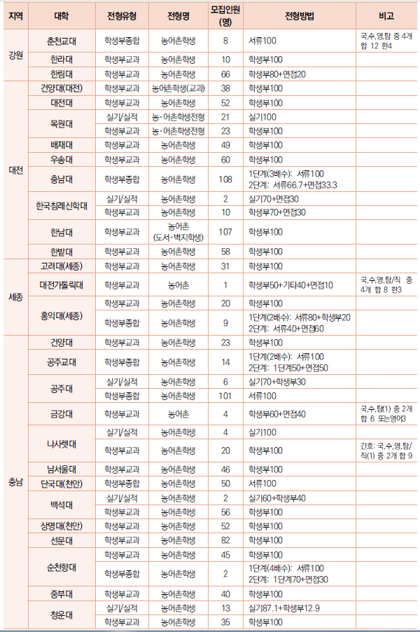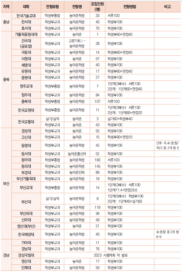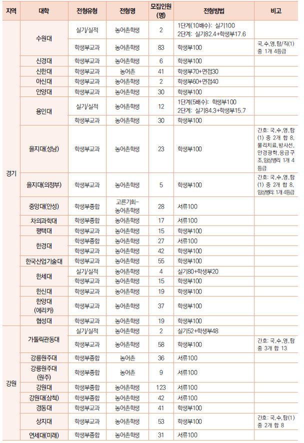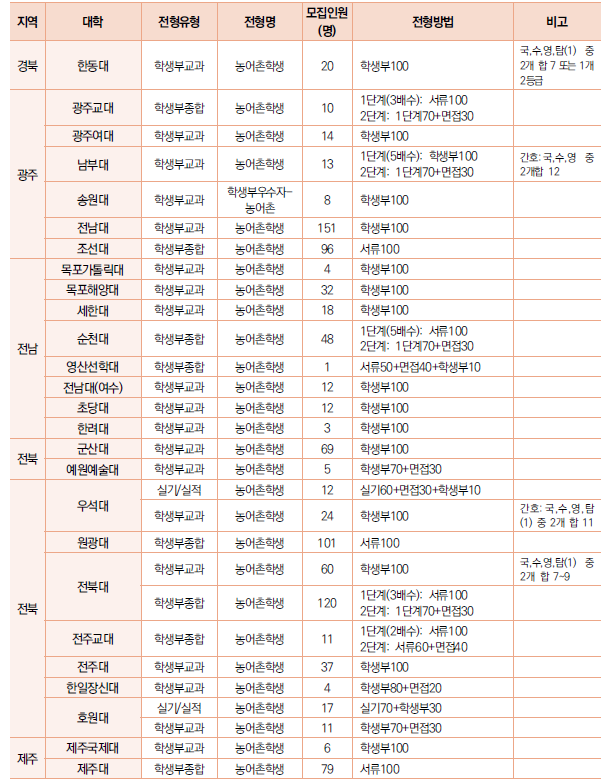 | 2023학년도 고른기회 특별전형 - 지역인재, 통합특별전형(국가보훈,농어촌,저소득,장애인,만학도,특성화고) (0) | 2021.12.06 |