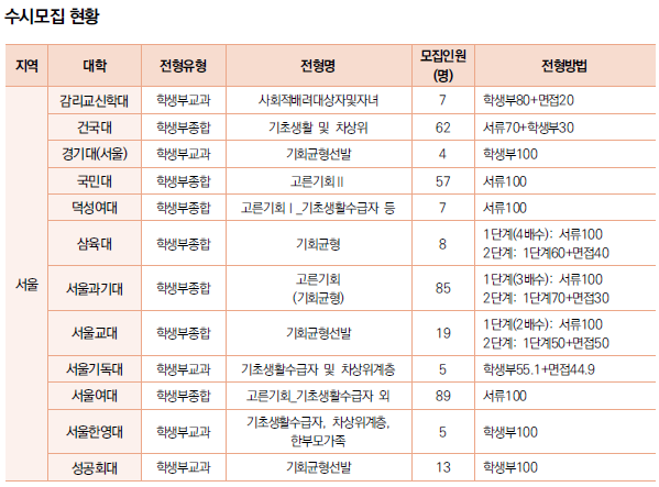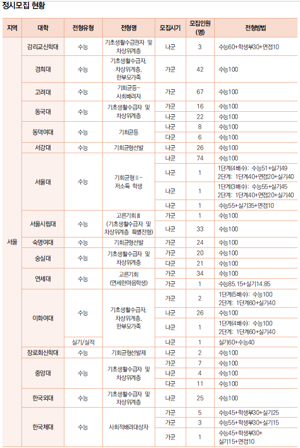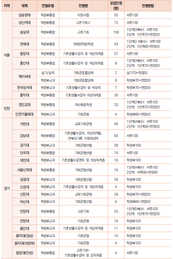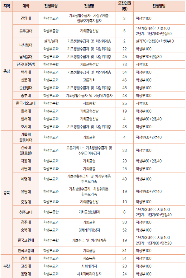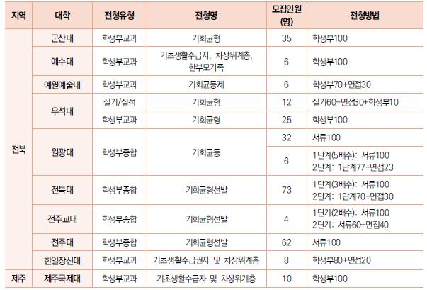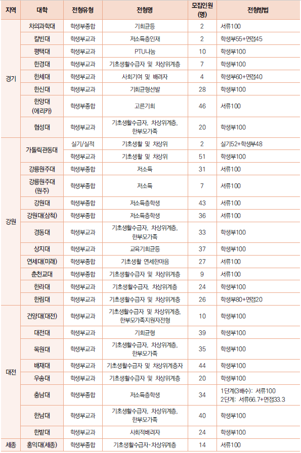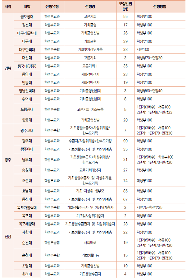 | 2023학년도 고른기회 특별전형 - 지역인재, 통합특별전형(국가보훈,농어촌,저소득,장애인,만학도,특성화고) (0) | 2021.12.06 |