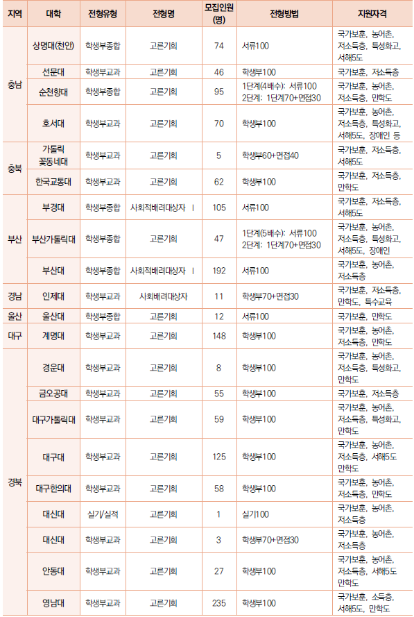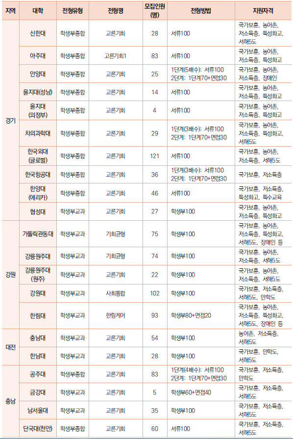 | 2023학년도 고른기회 특별전형- 기초생활수급자, 차상위계층, 한부모가족지원대상자, 사회배려대상자, 저소득학생, 기회균형 (3) | 2021.12.06 |