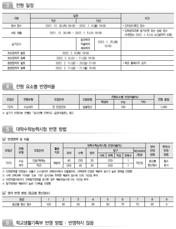 | 2022학년도 군산대학교/ 금오공과대학교/ 단국대학교 정시 모집요강 및 전년도 정시 커트라인 (0) | 2021.12.13 |