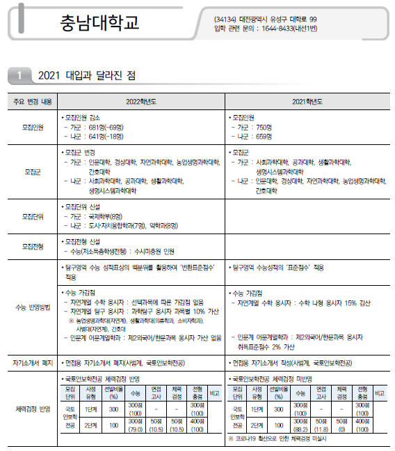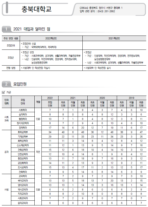 | 2022학년도 차의과학대학교/ 창원대학교/ 청주대학교 정시 모집요강 및 전년도 정시 커트라인 (0) | 2021.12.16 |