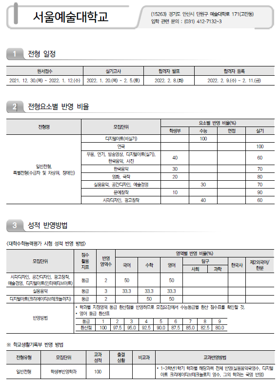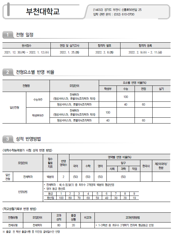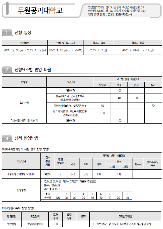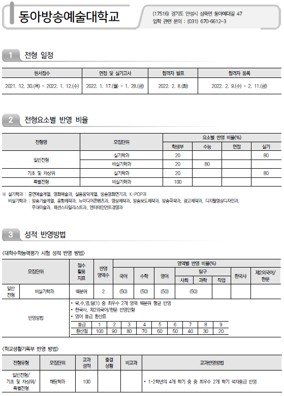 2022학년도 동아방송대/ 동원대/ 두원공과대/ 부천대/ 서영대(파주)/ 서울예술대 정시 모집요강 및 전년도 입시결과(정시 커트라인)