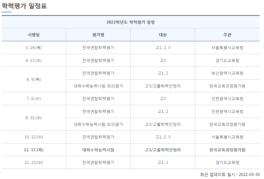 □ 2022학년도 전국연합학력고사 일정 및 출제범위