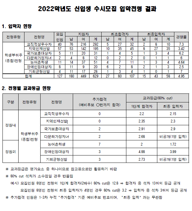 | 2022학년도 전남대학교 수시, 정시 입시결과(커트라인) (0) | 2022.05.23 |