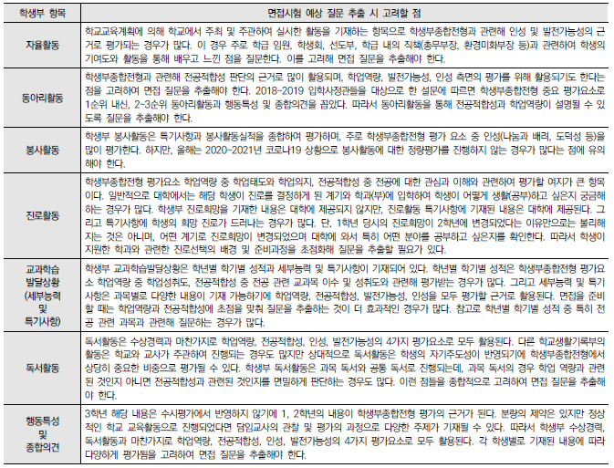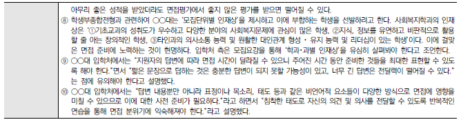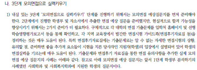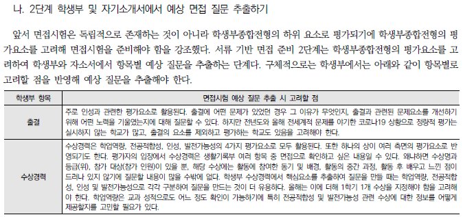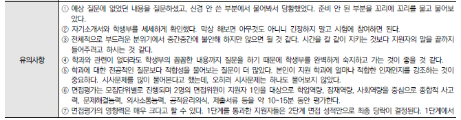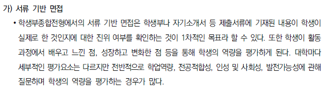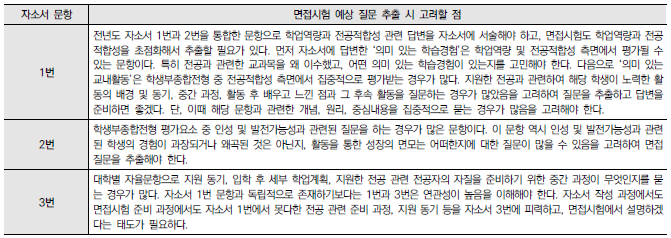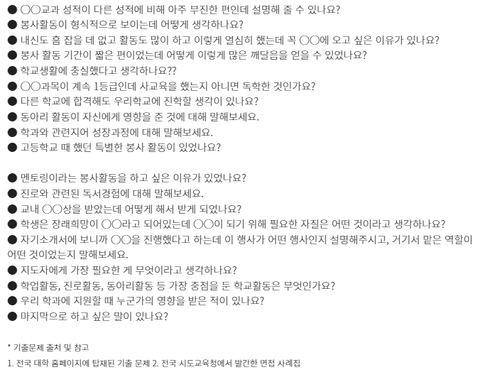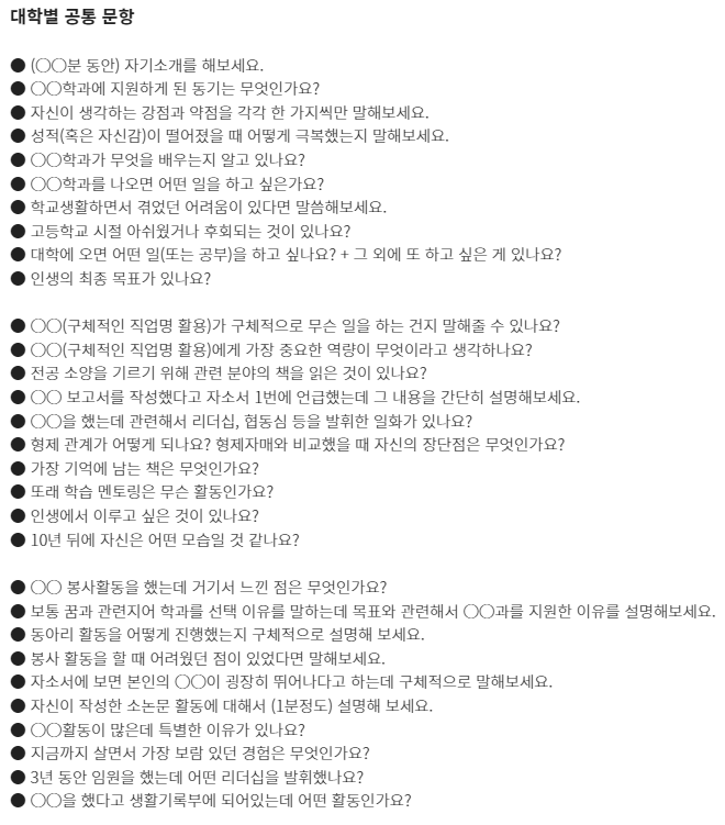 ★ 각 대학별 입학홈페이지에 수시 자료실에서 "면접기출문제"나 "면접예상문제"를 분석하거나 "선행학습영향평가보고서의 면접 및 구술고사"의 해당내용을 찾아 꼼꼼하게 분석하는 것이 도움이 된다.
