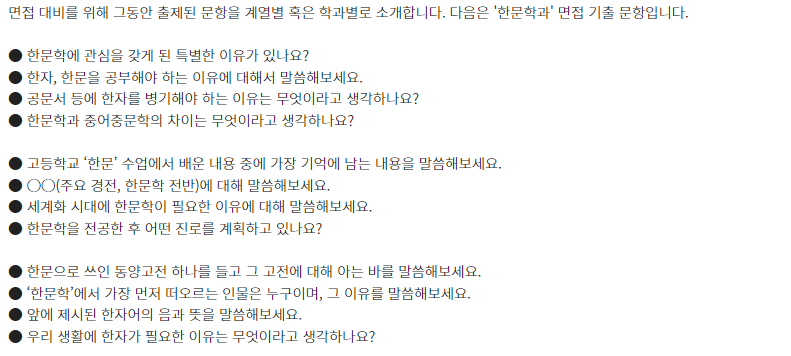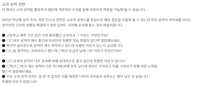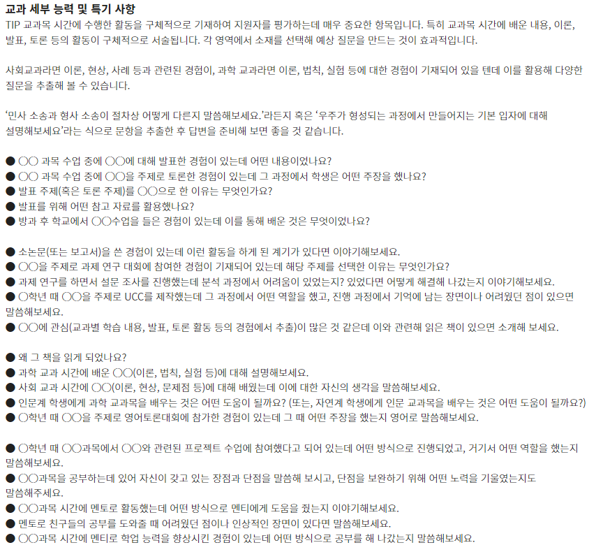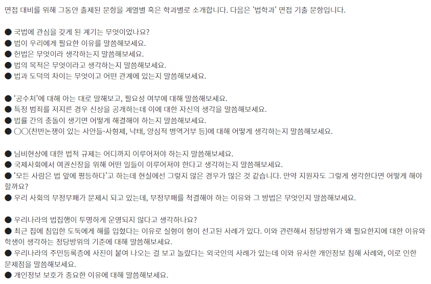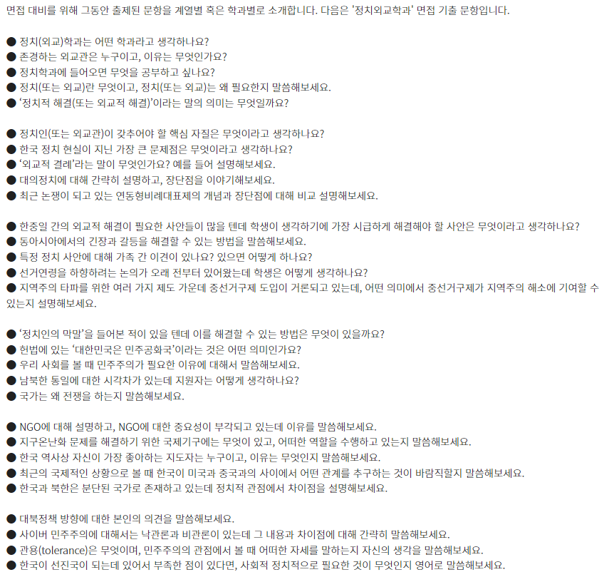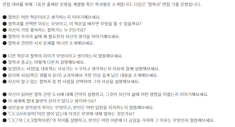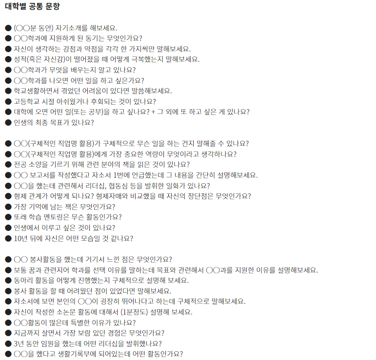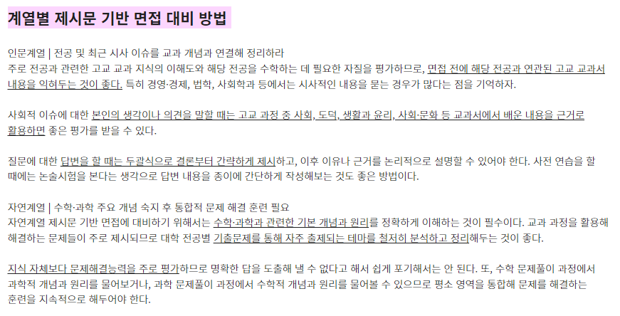 ★ 제시문면접 기출문제는 각 대학 입학홈페이지의 자료실에서 "면접 기출" 이나 "선행학습영향평가" 참조