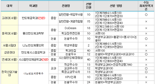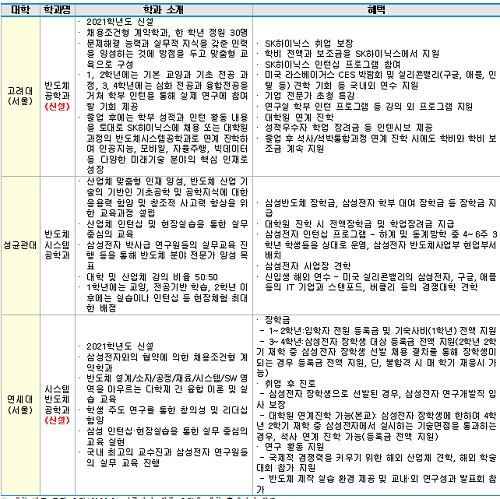 - 성균관대 반도체시스템공학과는 국내 첫 삼성전자와의 채용조건형 계약학과로 졸업 후 삼성전자로의 입사가 보장된다. 연세대 역시 삼성전자와 협약을 맺고 2021학년도부터 시스템반도체공학과 신입생을 선발한다. 삼성전자 연구,개발직으로 입사가 보장되고, 장학금과 교육 혜택은 성균관대와 유사하다. 고려대는 SK하이닉스와 협약을 맺고 2021학년도 부터 반도체 공학과 신입생을 선발하며 졸업 후 SK하이닉스 입사가 보장된다.
