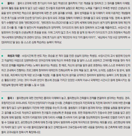 -물리2 : 영화 속 물리학 찾기 수행평가로 영화 '앤트맨', '앤트맨과 와스프'를 보고 양자 세계에 대해 관심이 생겨 양자 물리에 대해 개인적으로 조사를 함. 이를 더 발전시켜 터널링현상과 양자역학, 다이오드의 원리 등과 접목해 보고서를 제출하고, 수업시간 중 발표해 친구들과 선생님께 큰 호응을 받음. 이에 그치지 않고 조사 과정 중 알게 된 에사키 다이오드가 교과 과정에서 학습한 '미시세계와 양자현상'과 관련이 있다는것에 호기심이 생겨 '파인만의 여섯 가지 물리 이야기', '세상에서 가장 쉬운 양자역학 수업(리랴오)'을 읽는 등 스스로 심화 학습하는 능력이 뛰어남.....