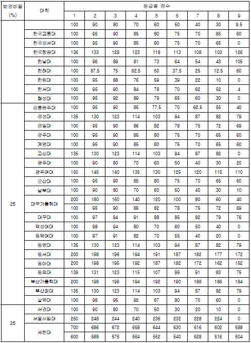 2022학년도 영어 대학별 등급점수 및 반영비율-자연계열