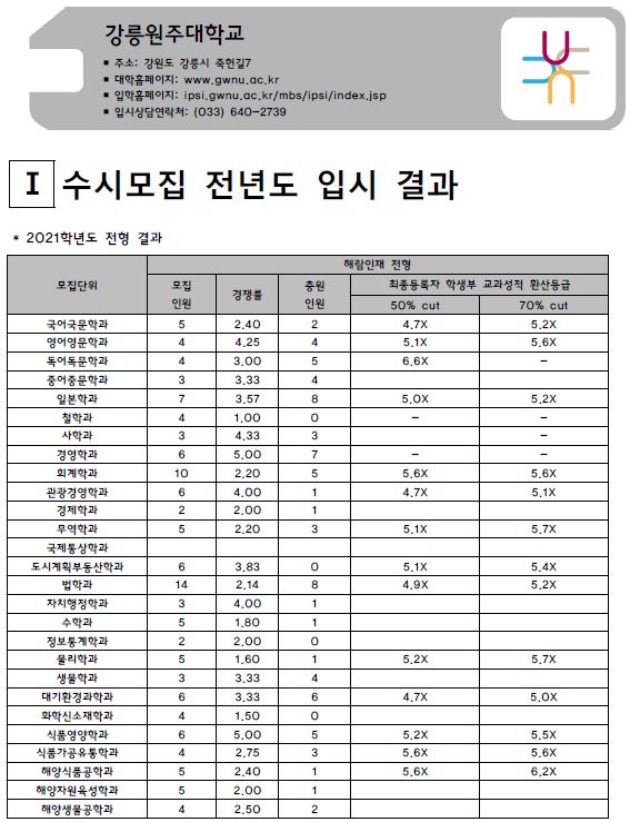 강릉원주대학교 2021학년도 입시결과-수시등급. 정시 커트라인